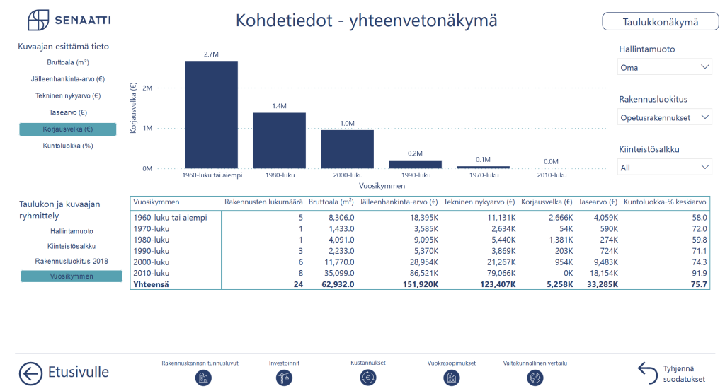 Kohdetiedot-näkymässä kunta voi suodattaa tilatiedoistaan esimerkiksi opetusrakennukset sekä ryhmitellä ne ja tarkastella niiden korjausvelkaa vuosikymmenittäin.