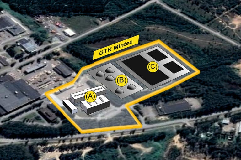 GTK Mintecin tilat Outokummussa: A) Laboratorio- ja koetehdastoiminnot. B) Rikastushiekka-alue – kuiva. C) Rikastushiekka-alue – märkä.